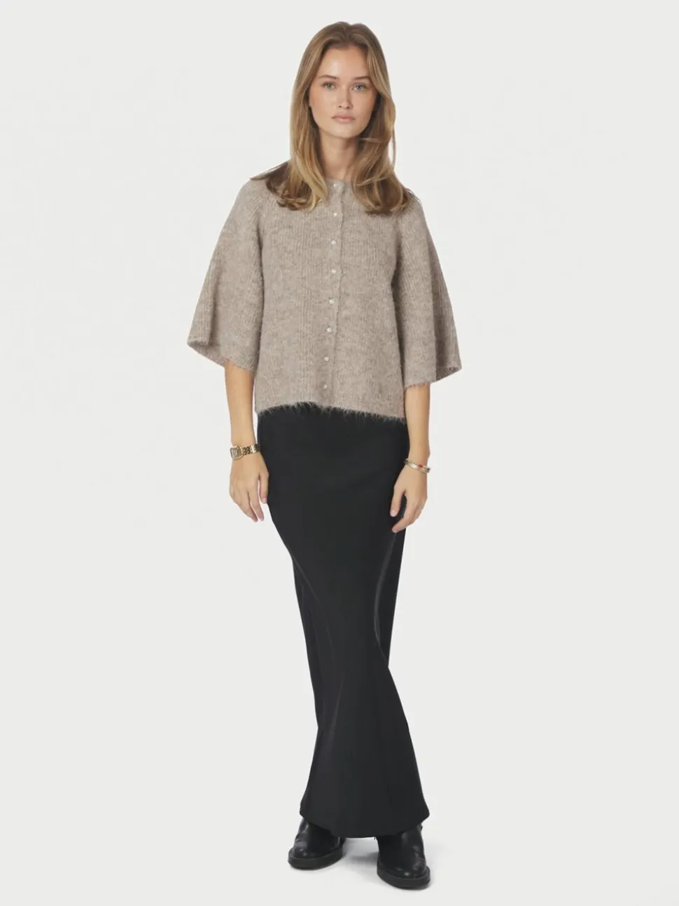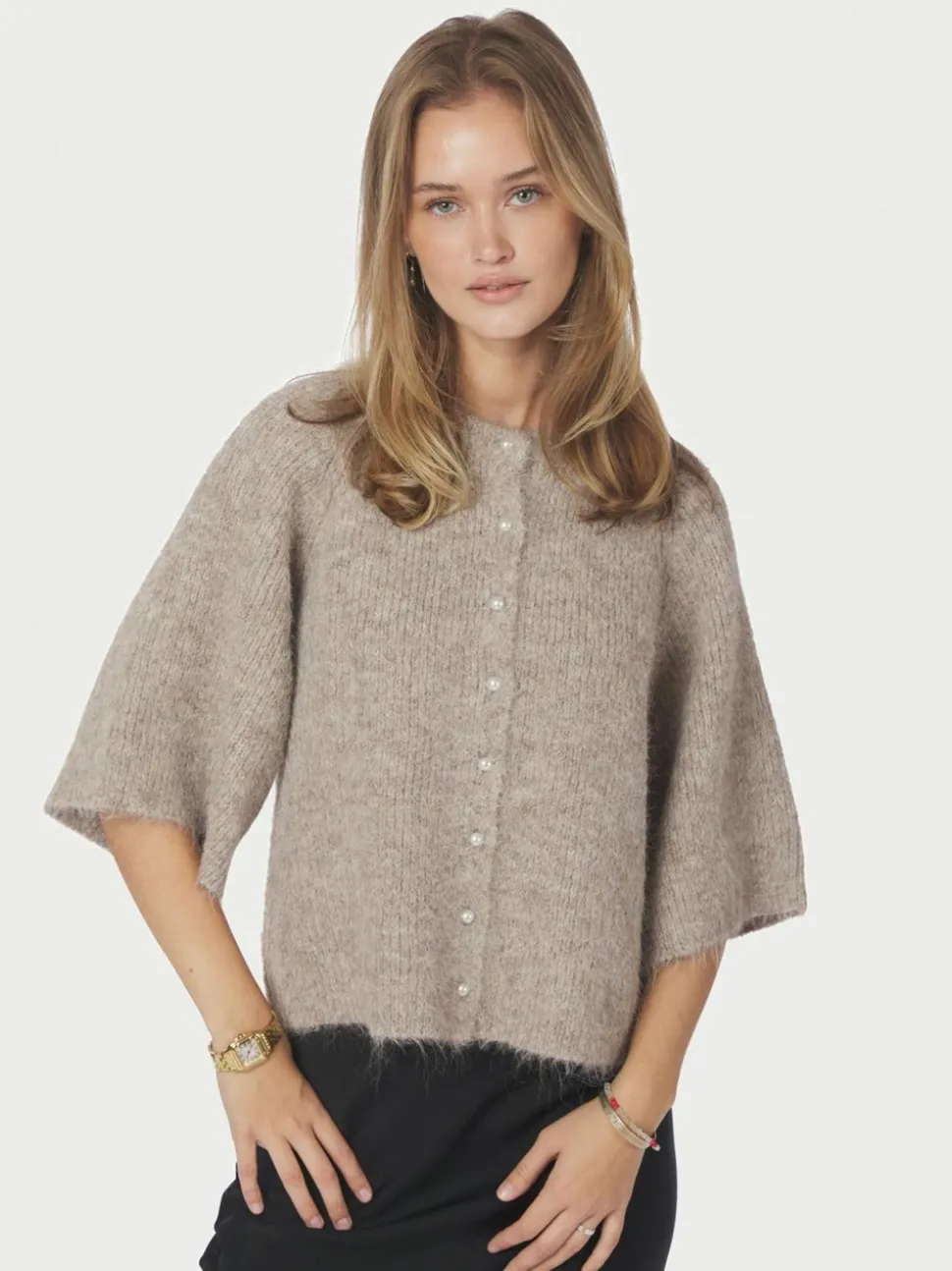 Amaya Fluffy Knit Cardigan fra Neo Noir er et elegant valg til din garderobe, der kombinerer stil og komfort på fornemmeste vis. Denne cardigan er designet med et moderne twist og byder på 3/4-ærmer, som giver et afslappet og smart look, der er perfekt til alle årstider. Den runde halsudskæring tilfører et klassisk touch, mens de fine perleknapper tilføjer en sofistikeret detalje, der virkelig får cardiganen til at skille sig ud. Med sin boxy pasform tilbyder denne cardigan en behagelig og rummelig fornemmelse, der gør den nem at bære over ethvert outfit, uanset om det er en simpel t-shirt eller en bluse. Knaplukningen giver fleksibilitet til at style cardiganen både åben og lukket, hvilket gør den alsidig til forskellige anledninger. Amaya Fluffy Knit Cardigan fra Neo Noir er det ideelle valg til dem, der ønsker at tilføje et strejf af elegance og funktionalitet til deres daglige påklædning.