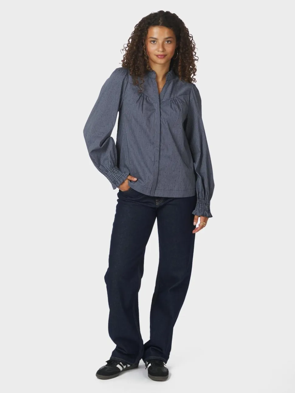 Astrida Stripe Stone Bluse fra Neo Noir er det perfekte valg til enhver garderobe, der ønsker et stilfuldt og moderne look. Denne bluse er designet med lange ærmer og en flatterende V-hals, der giver et elegant udtryk. De iøjnefaldende striber tilføjer et klassisk touch, mens den skjulte knaplukning sikrer et rent og sofistikeret design. Blusen er yderligere udsmykket med delikate flæsedetaljer, der giver et feminint præg, samt små sten, der tilføjer en subtil elegance. Med en almindelig pasform tilbyder Astrida Stripe Stone Bluse både komfort og stil, hvilket gør den ideel til både hverdag og festlige lejligheder. Uanset om den bæres med jeans for et afslappet look eller med en nederdel for en mere formel anledning, er denne bluse en alsidig tilføjelse til ethvert klædeskab.
