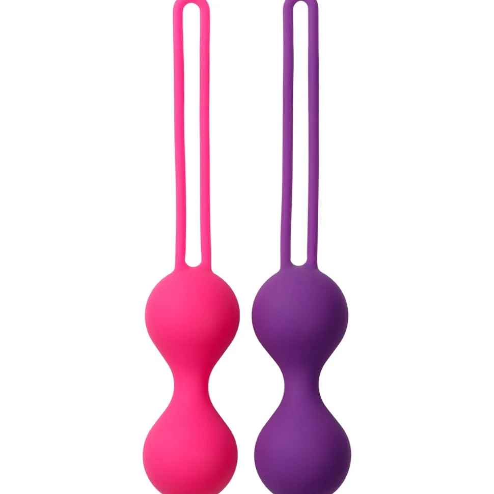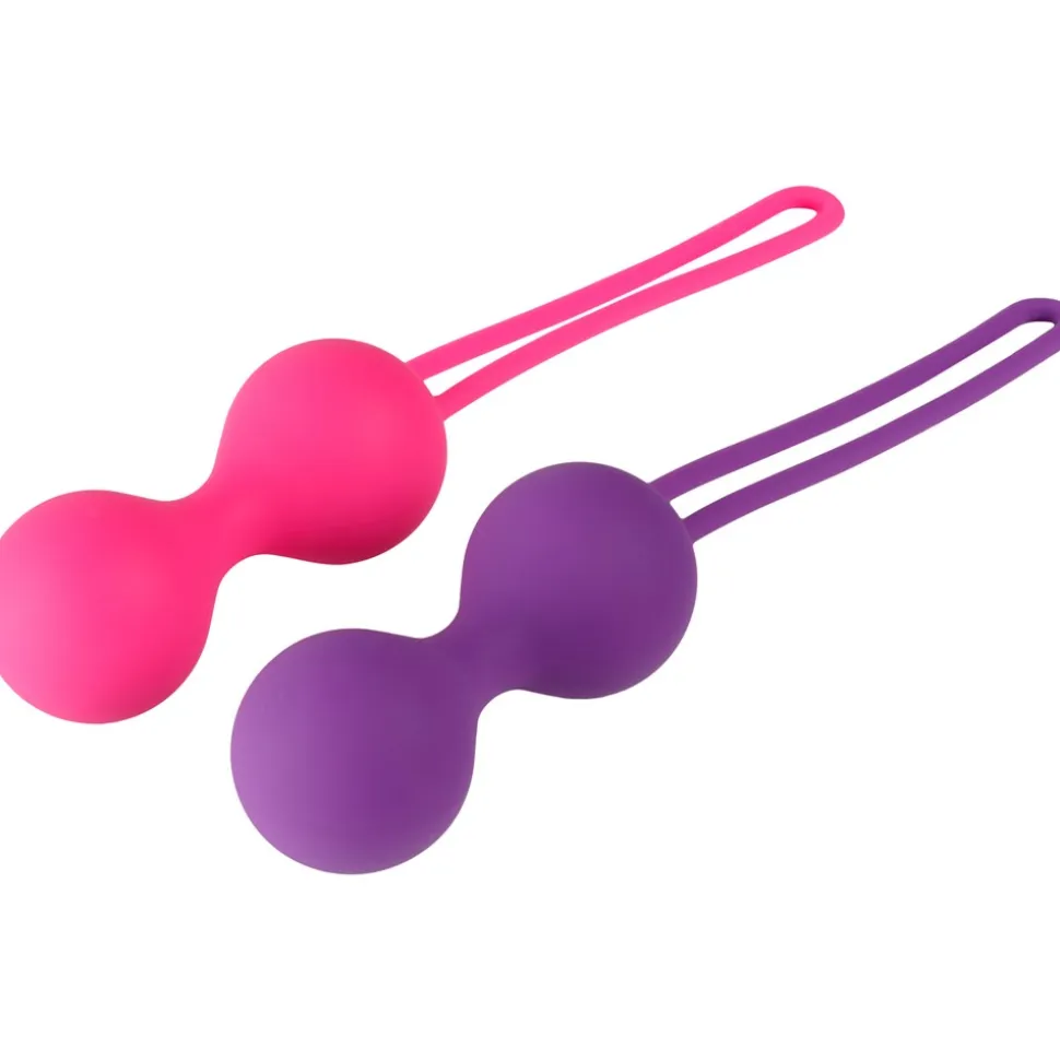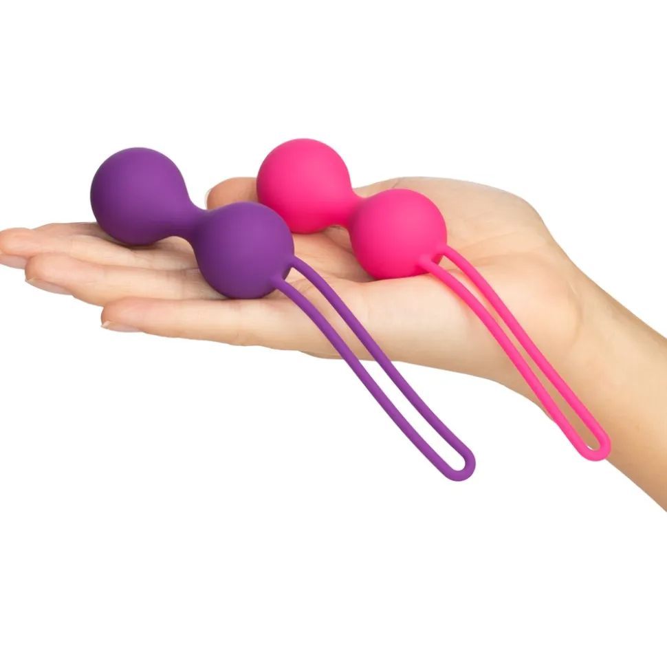 Sættet indeholder to dobbeltkugler, der er fremstillet i silkeblød silikone. Den letteste kugle vejer 48 g og indeholder roterende indre kugler, som aktiveres ved bevægelse. Når du er klar til en større udfordring, kan du skifte til den tungere kugle på 90 g, som er uden roterende kugler. Hver kugle har en lang snor, der gør det nemt at fjerne dem efter brug.