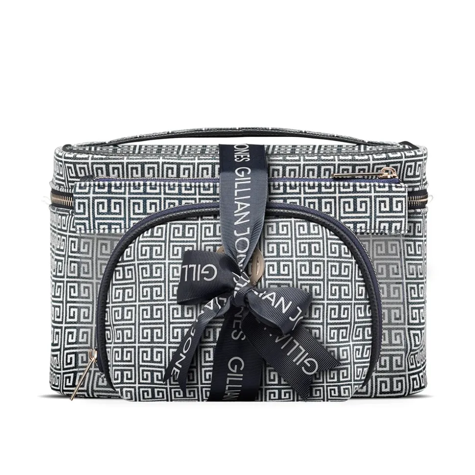 Beautyboksen kan rumme alle dine skønhedsprodukter, og er indrettet med en stor mesh/net lomme, som gør det nemt at overskue indholdet. To store lynlåsvedhæng giver nem adgang til boksen. Derudover medfølger en “check in bag” til flyrejsen, der opfylder IATA reglerne, og som er lavet i PVC-FRI plast. Sidst medfølger en fiks makeup pung i samme laminerede og vaskbare polyester. Makeup pungen har en stor åbning som giver et godt overblik over indholdet. Inden i er makeuppungen indrettet med en stor lynlåslomme. En fin Gillian Jones printet sløjfe gør dette 3-dele sæt til den perfekte gave.