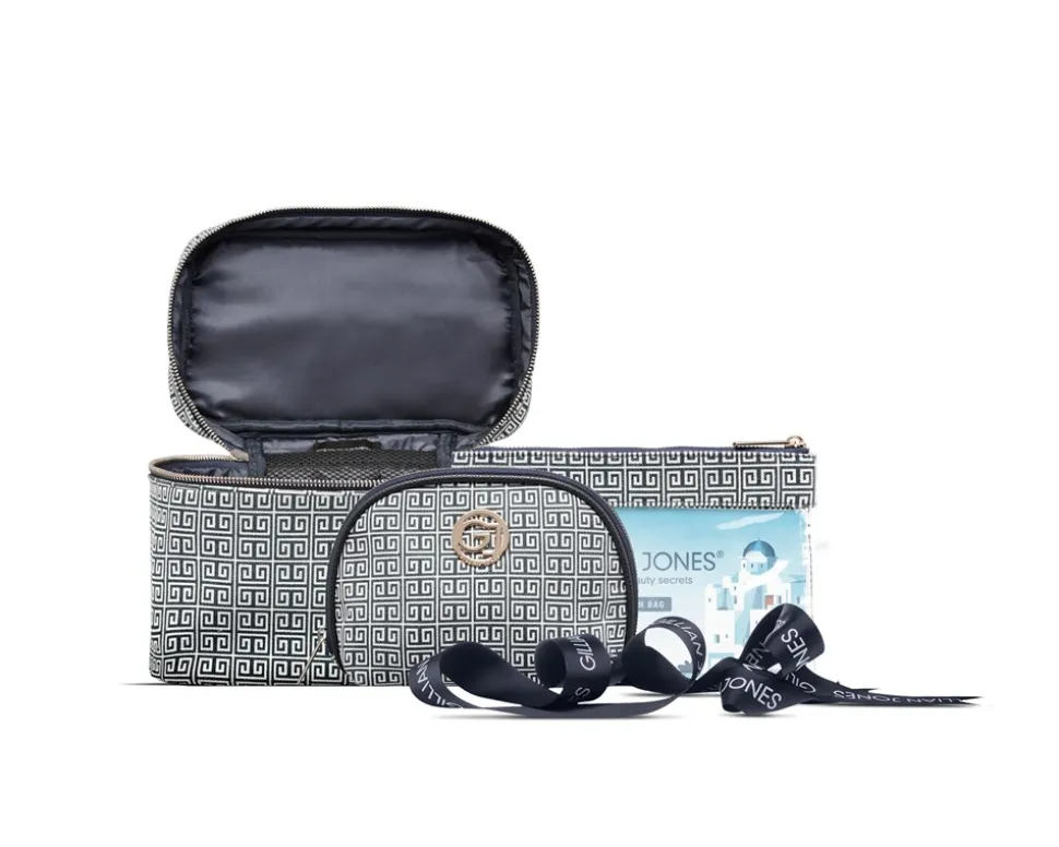 Boks sæt med 3 dele i blåt og hvid GJ signatur print. Her er alt hvad du har brug for til din rejse. Fremstillet i 100% genanvendt plastik, der nemt rengøres med en fugtig klud.
