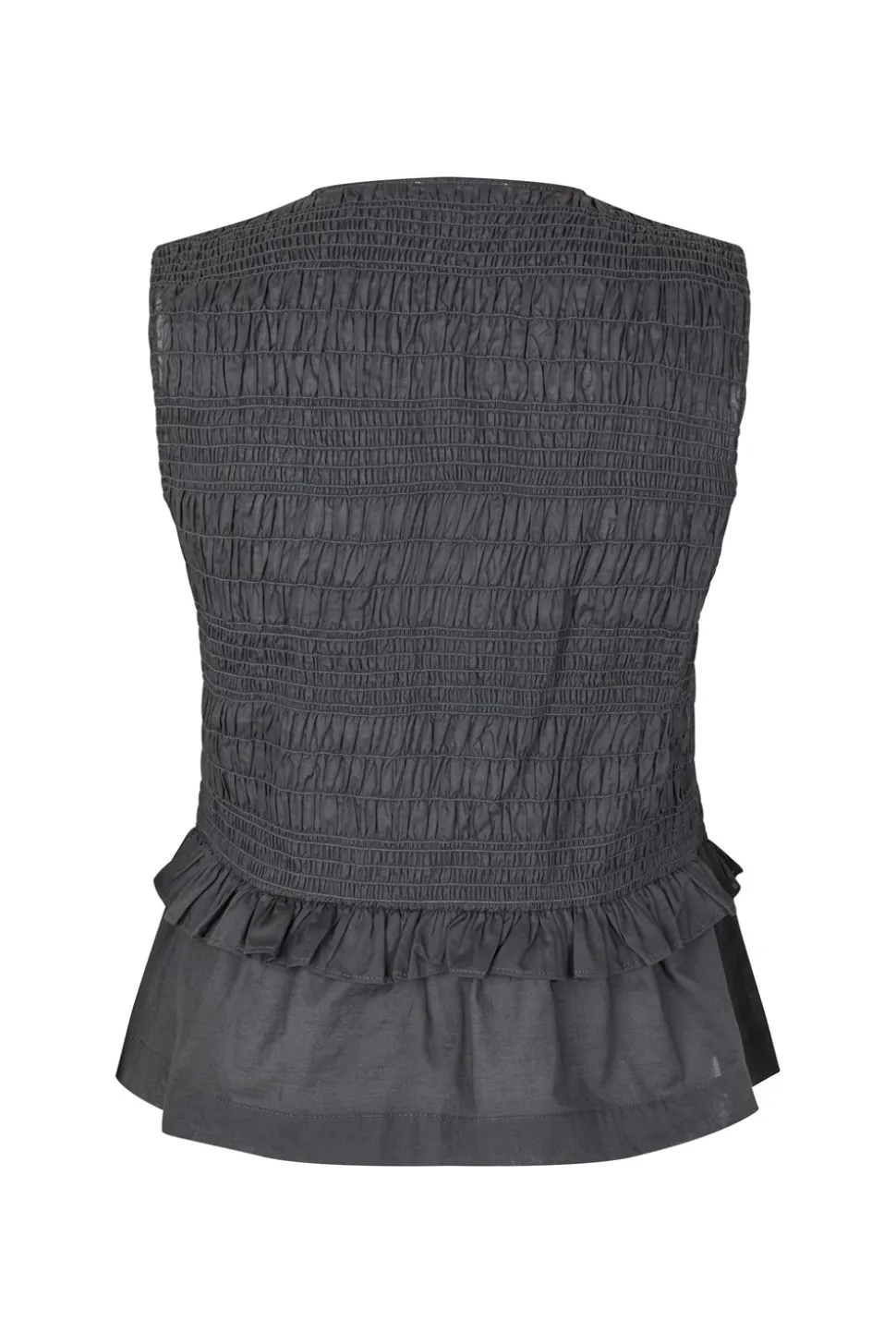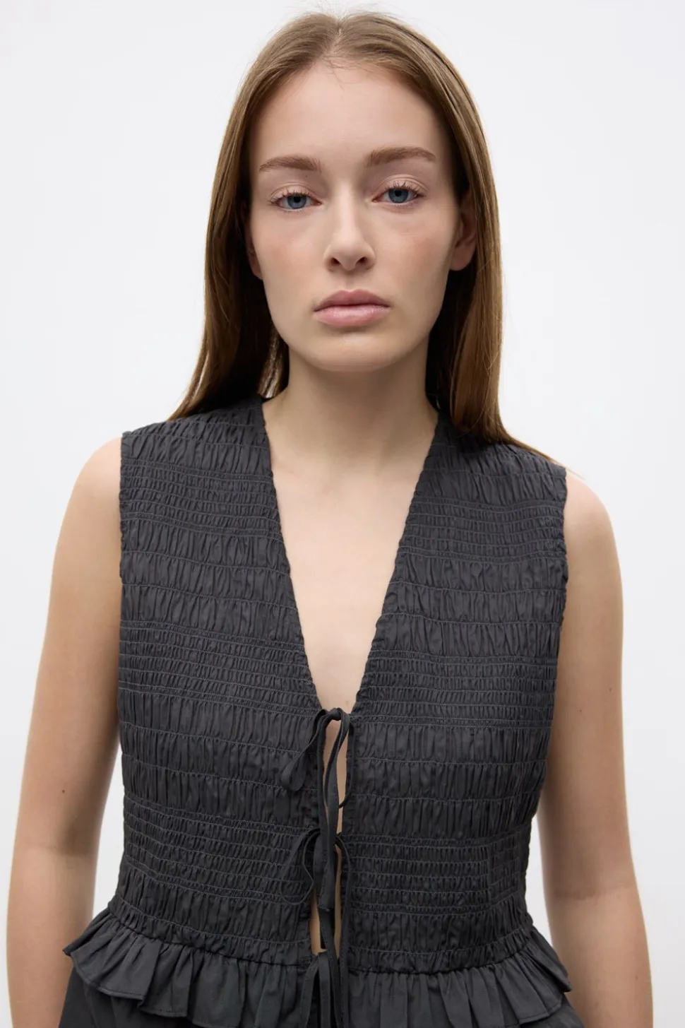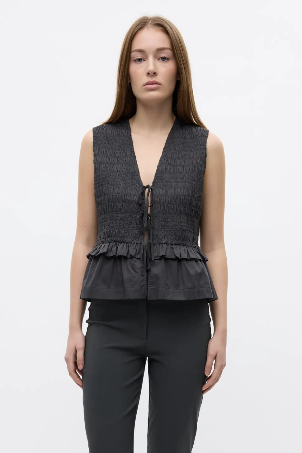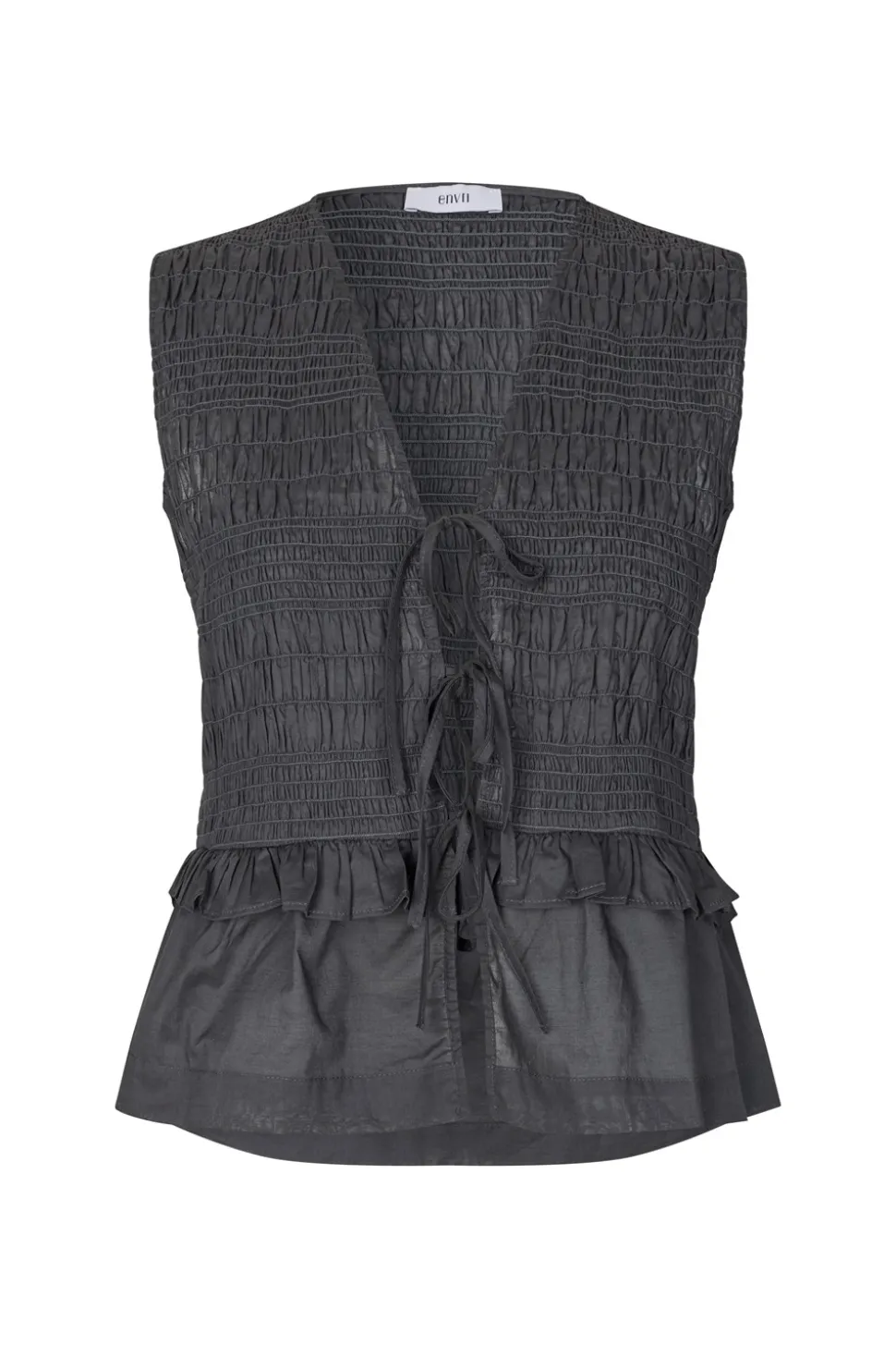 Opgrader din garderobe med Encecilia vesten fra Envii, der kombinerer moderne design med komfort. Denne vest er designet til at give dig et stilfuldt lag til enhver anledning. Med sin dybe V-udskæring tilføjer den en feminin touch til dit outfit, mens bindebåndet foran giver mulighed for en justerbar pasform og et personligt præg. Vesten har en smock-struktur, der understreger dens unikke design og skaber en smigrende silhuet. De elegante flæsedetaljer og peplumeffekten tilfører et ekstra lag af elegance og femininitet, som gør den perfekt til både hverdag og festlige lejligheder. Den er ærmeløs, hvilket gør den ideel til at bære over en langærmet bluse eller en simpel t-shirt. Med en almindelig pasform sikrer Encecilia vesten, at du både ser godt ud og føler dig tilpas hele dagen. Uanset om du styler den til kontoret eller en aften ude, vil denne vest fra Envii være et alsidigt og stilfuldt valg.