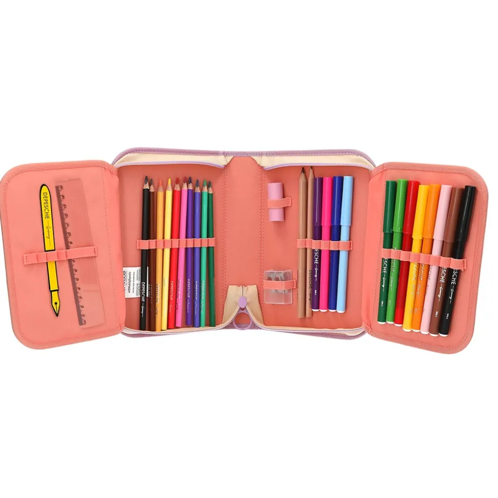 - Inkl. 12 tusser, 10 farveblyanter, 2 blyanter, 1 blyantspidser, 1 viskelæder, 1 alm. lineal og 1 trekantlineal