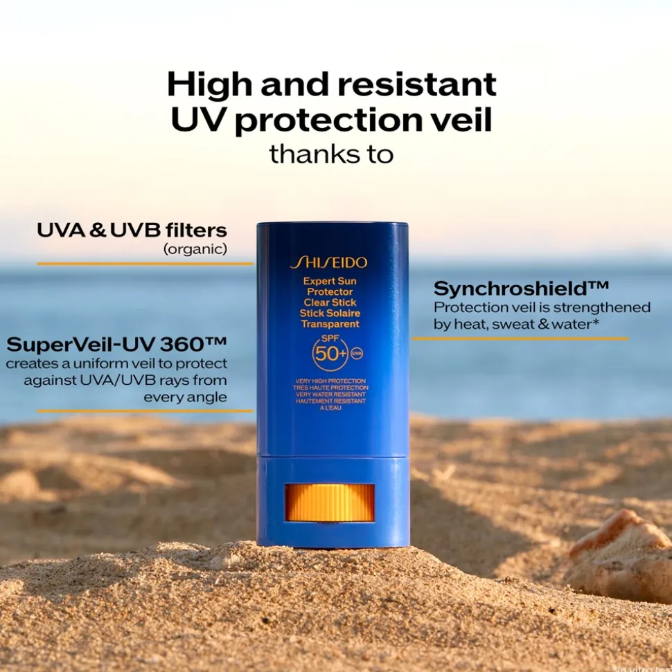 Shiseido Global Sun Care Clear Stick SPF 50+ er en praktisk, vandresistent solbeskyttekse i stickform med en let og transparent konsistens, der lader huden ånde. Den transparente og ikke-klæbende finish gør denne solbeskyttelse ideel til alle hudtyper, og den er nem at påføre, når man er på farten. SynchroShield™-teknologien forstærker den beskyttende barriere ved kontakt med varme, vand eller sved. SuperVeil-UV 360™ skaber et effektivt og homogent forsvar mod UVA/UVB-stråler, mikrostøvpartikler og tørhed. NatureSurgeComplex absorberer forurenende partikler og reducerer oxidation. Formlen indeholder 65 % hudplejende ingredienser, herunder arganolie, der fugter i 8 timer. Profense CL modvirker UV-relaterede skader som rynker og en uensartet hudtone, for en glattere og mere fyldig hud.