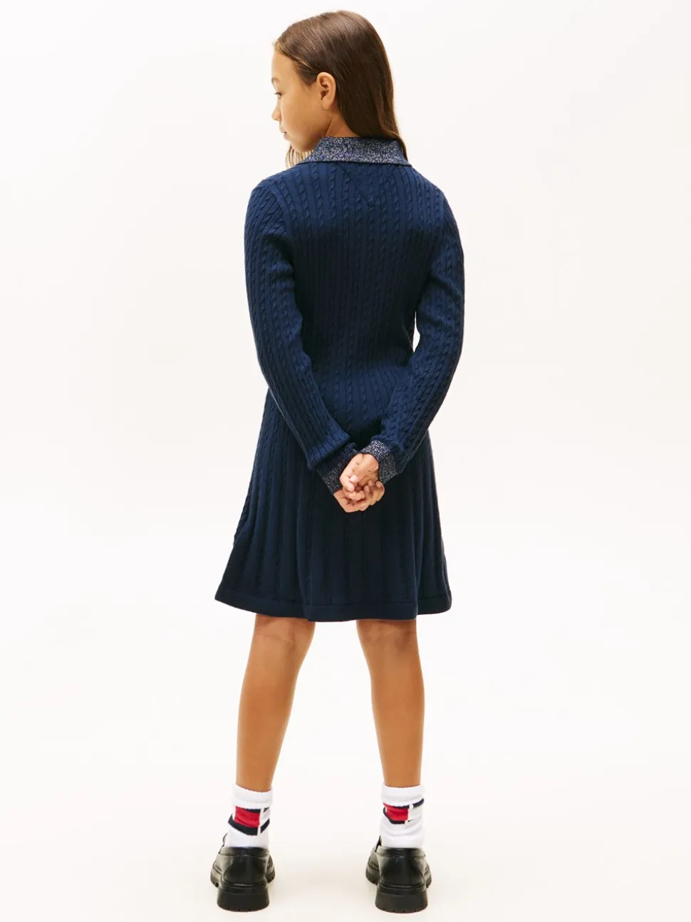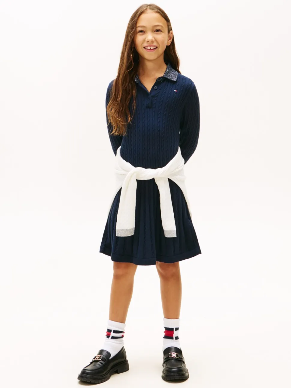 Tommy Hilfigers Mini Cable Kjole er det perfekte valg til piger, der ønsker en kombination af klassisk stil og moderne detaljer. Denne kjole er fremstillet i blødt bomuldsmateriale, der sikrer komfort hele dagen. Den lange ærmekonstruktion gør den ideel til køligere dage, mens kabelstrikdesignet tilføjer en tidløs tekstur, der fremhæver det elegante look.Et karakteristisk træk ved denne kjole er dens stilfulde polokrave, der er udstyret med tre knapper, hvilket giver mulighed for en varieret styling. Glimmerdetaljer på både krave og manchetter giver en subtil glamour, der tiltrækker opmærksomhed på den mest sofistikerede måde. Som en ekstra detalje har kjolen også Tommy Hilfigers ikoniske flagbroderi på brystet, hvilket understreger brandets arv og kvalitet. Mini Cable Kjolen kombinerer praktiske funktioner med æstetiske detaljer, hvilket gør den til et must-have i enhver ung piges garderobe.