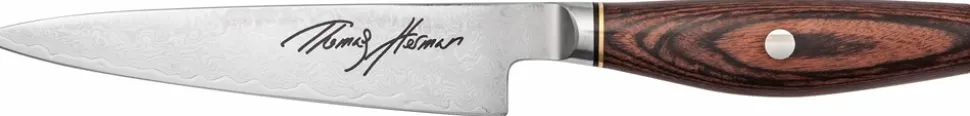 Miyabi X Herman Shotoh Kniv er et sublimt eksempel på, hvad der sker, når innovativt design møder exceptionelt håndværk. Denne kniv er skabt i samarbejde med den anerkendte kok Thomas Herman, hvilket sikrer både kvalitet og funktionalitet til det moderne køkken. Fremstillet af rustfrit stål, garanterer kniven en lang levetid og pålidelig ydeevne. Det skarpe skæreværktøj gør den til en fremragende universalkniv, der nemt klarer alle opgaver i køkkenet. Håndtaget er lavet af pakkatræ, som giver et solidt og komfortabelt greb under brug, hvilket er essentielt for præcision og kontrol. Selvom kniven er robust og holdbar, bør den ikke komme i opvaskemaskinen for at bevare dens skarphed og finish i længere tid. Med en bladlængde på 13 cm er den ideel til præcise skæreopgaver, mens dens dimensioner på H: 3,2 x L: 24,4 x B: 2 cm gør den håndterbar og let anvendelig. Dette er den perfekte tilføjelse til enhver køkkensamling, hvor både æstetik og funktionalitet værdsættes.