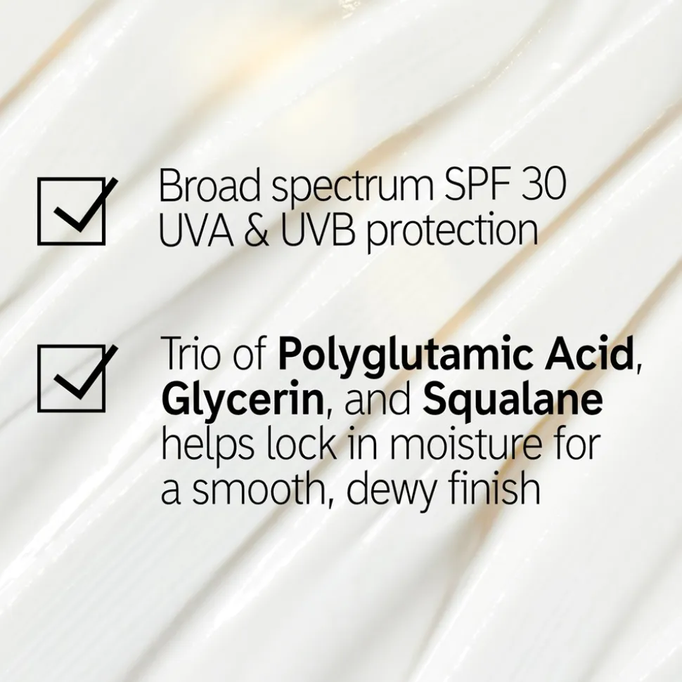 Det vigtigste trin i din hudplejerutine, Polyglutamic Acid Dewy Sunscreen SPF 30, er din daglige must have til en beskyttet og strålende hud. Med SPF 30-, UVA- og UVB-beskyttelse er denne lette solcreme formuleret til at fungere til alle hudtoner og smelter problemfrit ind i huden og efterlader en uopdagelig, lysende finish (97% sagde, at den så usynlig ud på deres hudtone*). Beriget med hudplejende ingredienser, herunder en 8% fugtgivende trio, der kombinerer polyglutaminsyre, glycerin og squalane, hjælper det med at låse fugt og leverer et ultrahydrerende boost. Den ikke-fedtede, ikke-fnulleret formel efterlader huden glat, strålende og hydreret, hvilket skaber den perfekte base, når den bæres alene eller påføres under makeup. Det er tid til at nyde solen uden at gå på kompromis med din solbeskyttelse.