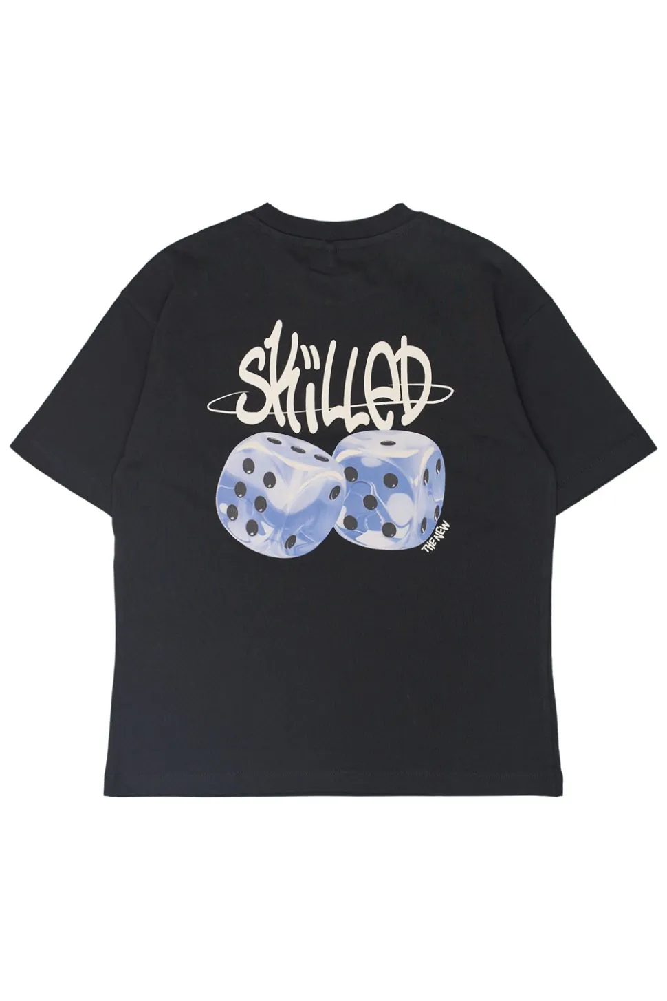 - Print med to terninger og et stort “SKILLED” grafisk design bagpå