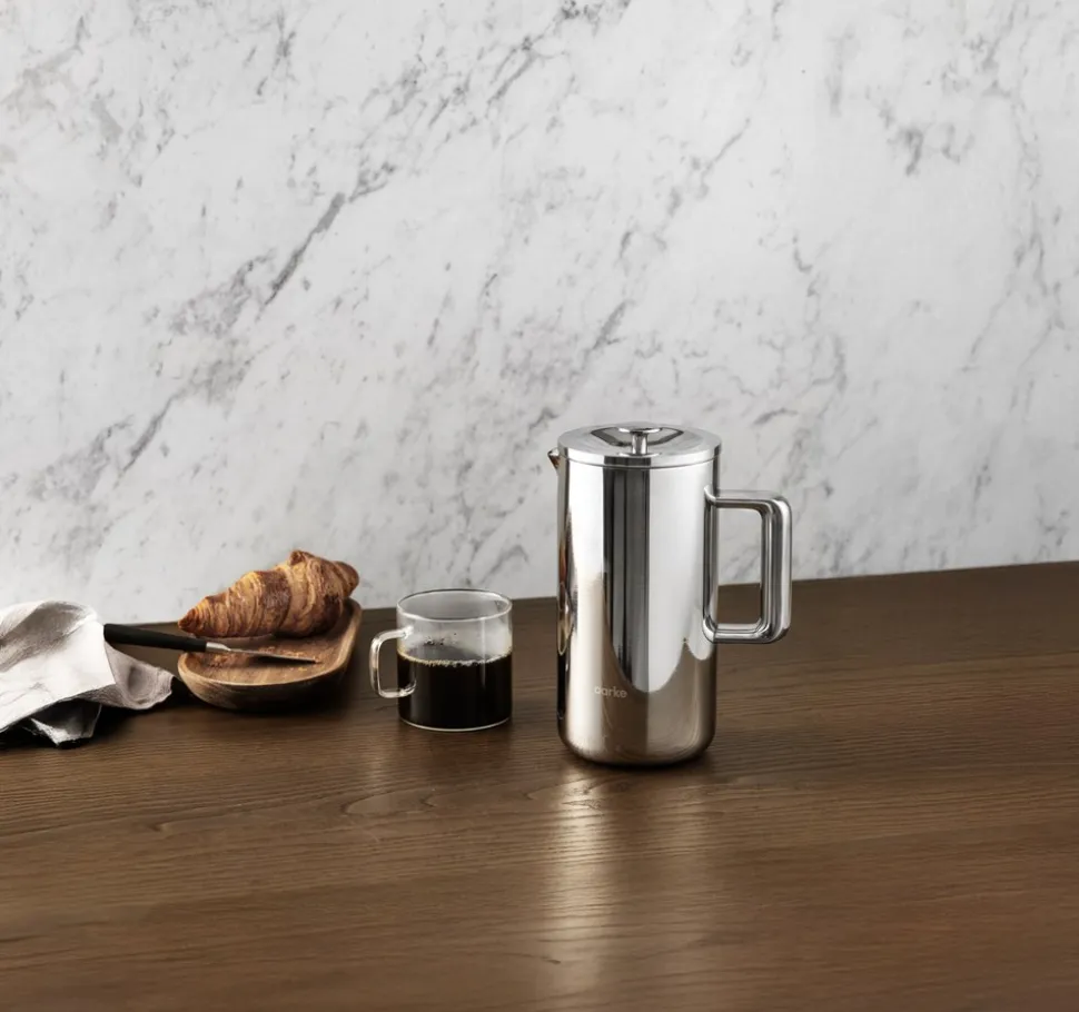 Stempelkanden fra Aarke er et elegant valg for kaffeentusiaster, der ønsker en kombination af funktionalitet og stil. Fremstillet i robust rustfrit stål, er denne stempelkande designet til at holde. Den dobbeltvæggede konstruktion og det vakuumisolerede kabinet sikrer, at dine drikke forbliver varme i op til 3 timer, mens ydersiden forbliver kølig at røre ved. Dette gør den ideel til både hjemmebrug og servering ved sociale sammenkomster.Kanden har et stålnetfilter, der effektivt holder kaffegrums tilbage, og den spildfri tud sikrer en nem og præcis hældning uden at dryppe. Med en kapacitet på 1 liter kan den brygge op til 8 kopper kaffe, perfekt til større familier eller når du har gæster. Den er også praktisk, da den tåler opvaskemaskine, hvilket gør rengøringen til en leg. Det enkle og tidløse design passer ind i ethvert køkken, og med en størrelse på H: 21,5 x B: 18 x D: 11 cm er den kompakt nok til nem opbevaring, mens den stadig gør en indflydelsesrig tilføjelse til køkkenbordet.