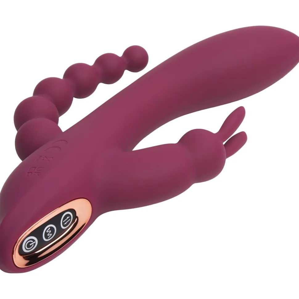 Sinful Triple Fun Bordeaux Rabbit Vibrator er din vej til ultimativ nydelse. Med både vaginal, anal og klitorisstimulation vil denne vibrator sende dig direkte mod orgasme. Det kurvede skaft glider perfekt på plads i vagina, mens analkæden fylder dig bagtil, og kaninørene forkæler din klitoris. Udforsk de tre pirrende funktioner og oplev vibrationerne tage nydelsen til nye højder.