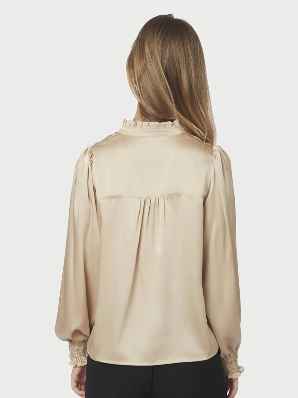 Oplev den elegante stil med Zamola Bluse fra Neo Noir, en alsidig tilføjelse til enhver garderobe. Denne langærmede bluse kombinerer klassiske elementer med moderne detaljer, der gør den perfekt til både hverdagsbrug og mere formelle anledninger. Med en skjult knaplukning får blusen et rent og sofistikeret udtryk, samtidig med at flæsedetaljerne tilføjer en feminin charme.Blusen har en rund halsudskæring, der giver en tidløs stil, mens smock for enden af ærmet sikrer en behagelig pasform og et elegant touch. Den almindelige pasform gør, at denne bluse sidder flot og komfortabelt uden at gå på kompromis med stil. Det luksuriøse satinlook giver et strejf af glamour, der løfter dit outfit til et nyt niveau. Uanset om du styler den med jeans for et afslappet look eller med en nederdel for en mere poleret fremtoning, er Zamola Bluse et must-have for modebevidste kvinder.