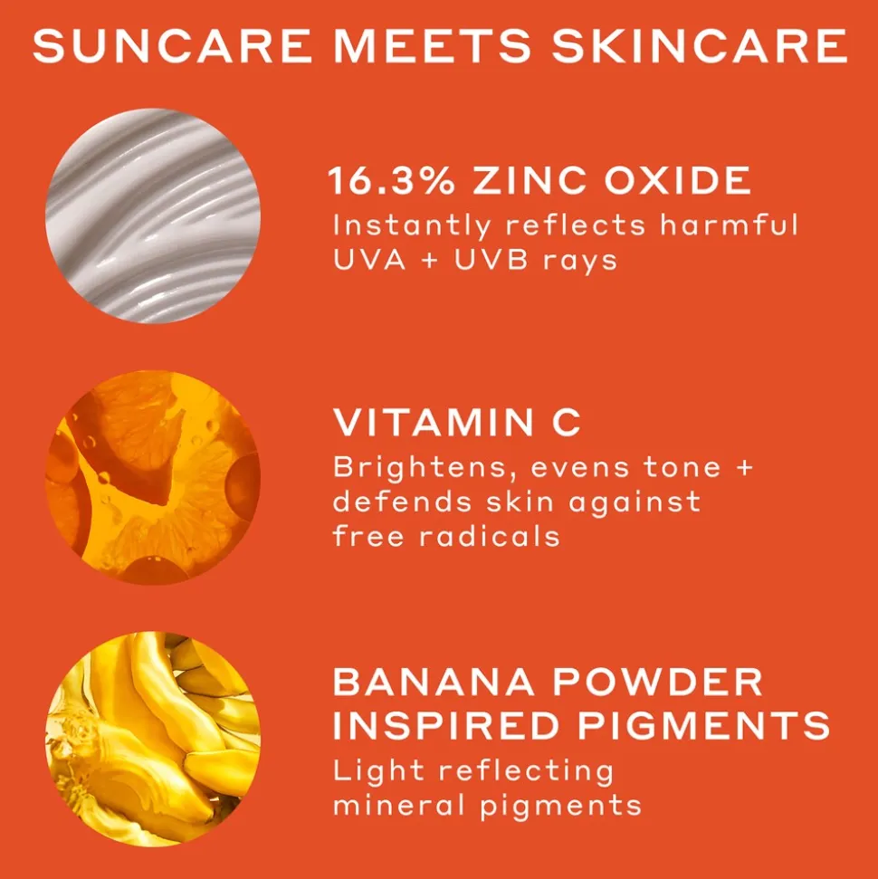Denne meget effektive solcreme kombinerer bredspektret mineralsk SPF30, C vitamin og lysreflekterende mineralske pigmenter så huden beskyttes OG korrigerer trist og uens hudtone hen over tid. Mineralsk solfilter tager længere tid at blive absorberet i huden kontra et kemisk filter. Grundet en høj koncentration af zink i formularen (16,3%) og alt afhængig af hudtone, kan SPF produkter efterlade et let hvidt skær, som forsvinder efter noget tid. For at kompensere for det hvide skær, tilføjede de deres ikoniske lysreflekterende mineralske bananpudder-inspirererede pigmenter.