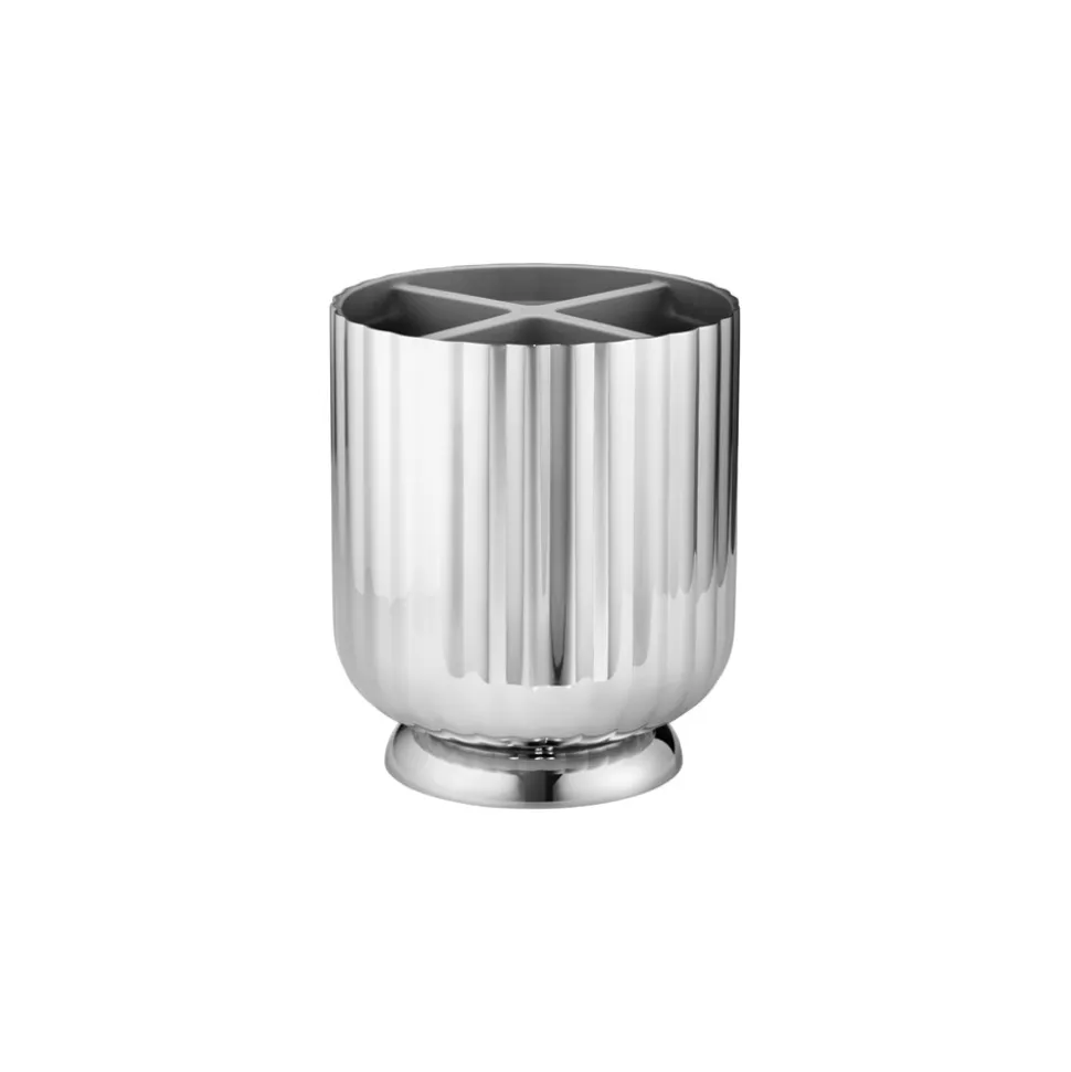 Bernadotte Bestikholder fra Georg Jensen er en stilfuld og funktionel løsning til opbevaring af dit bestik. Denne bestikholder er lavet i rustfrit stål, hvilket sikrer både holdbarhed og et tidløst udtryk. Med sit runde design og riflet yderside tilføjer den et elegant touch til ethvert borddækning eller køkkenarrangement. Det blankpolerede udseende forstærker dens æstetiske appel og gør den til et iøjnefaldende element i hjemmet.Denne bestikholder er designet til at kunne rumme op til seks sæt bestik, hvilket gør den både praktisk og pladsbesparende. Den er desuden udstyret med en TPE-indsats, der gør rengøringen let og problemfri. Med en størrelse på H: 15,1 x Ø: 13 cm er den kompakt og passer perfekt på køkkenbordet eller i skabet. Bernadotte Bestikholder kombinerer enkelhed og funktionalitet, hvilket gør den til et must-have for enhver, der ønsker at organisere sit bestik med stil og elegance.