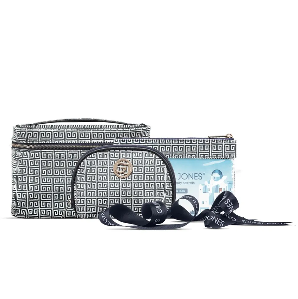 Beautyboksen kan rumme alle dine skønhedsprodukter, og er indrettet med en stor mesh/net lomme, som gør det nemt at overskue indholdet. To store lynlåsvedhæng giver nem adgang til boksen. Derudover medfølger en “check in bag” til flyrejsen, der opfylder IATA reglerne, og som er lavet i PVC-FRI plast. Sidst medfølger en fiks makeup pung i samme laminerede og vaskbare polyester. Makeup pungen har en stor åbning som giver et godt overblik over indholdet. Inden i er makeuppungen indrettet med en stor lynlåslomme. En fin Gillian Jones printet sløjfe gør dette 3-dele sæt til den perfekte gave.