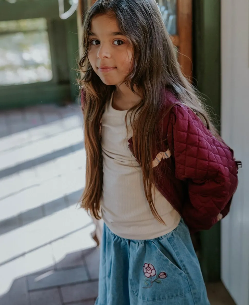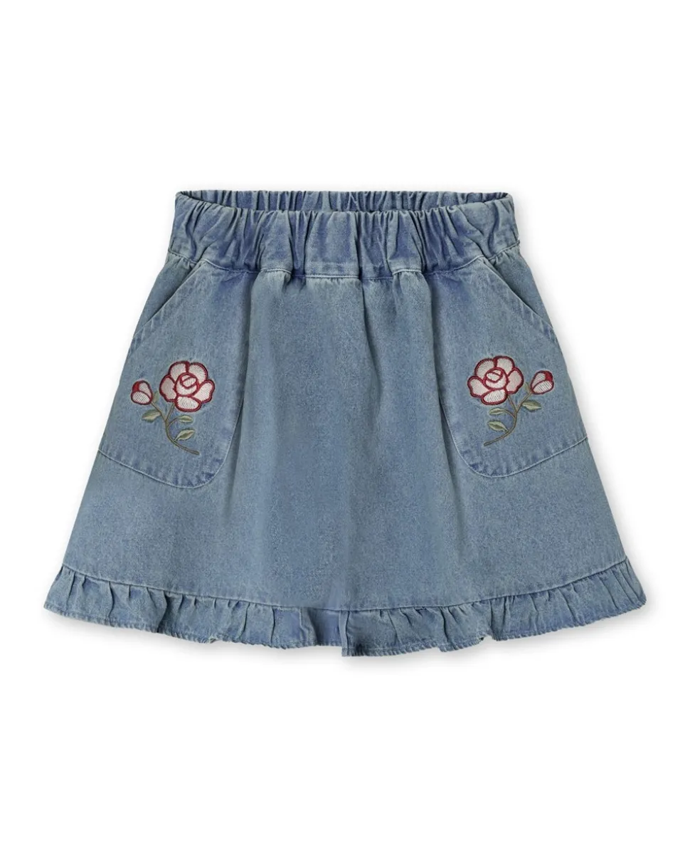 Fliinks Don Rose nederdel er den perfekte tilføjelse til dit barns garderobe. Med et stilfuldt denimdesign kombinerer denne nederdel både komfort og moderne æstetik. Et par elegante sidelommer er smukt pyntet med broderede roser, der giver et unikt touch og fanger blikket. Nederdelen afsluttes med fine flæsedetaljer nederst, hvilket skaber en feminin og legende stil.For ekstra komfort har Don Rose nederdelen elastik i taljen, hvilket sikrer en god pasform hele dagen. Det er en alsidig nederdel, der let kan styles som et sammenhængende sæt med den matchende Don Rose Bomberjakke, hvilket giver en komplet og koordineret look til dit barn. Uanset om det er til hverdagsbrug eller en særlig lejlighed, vil denne nederdel fra Fliink være et hit for enhver pige.