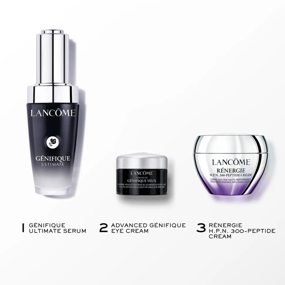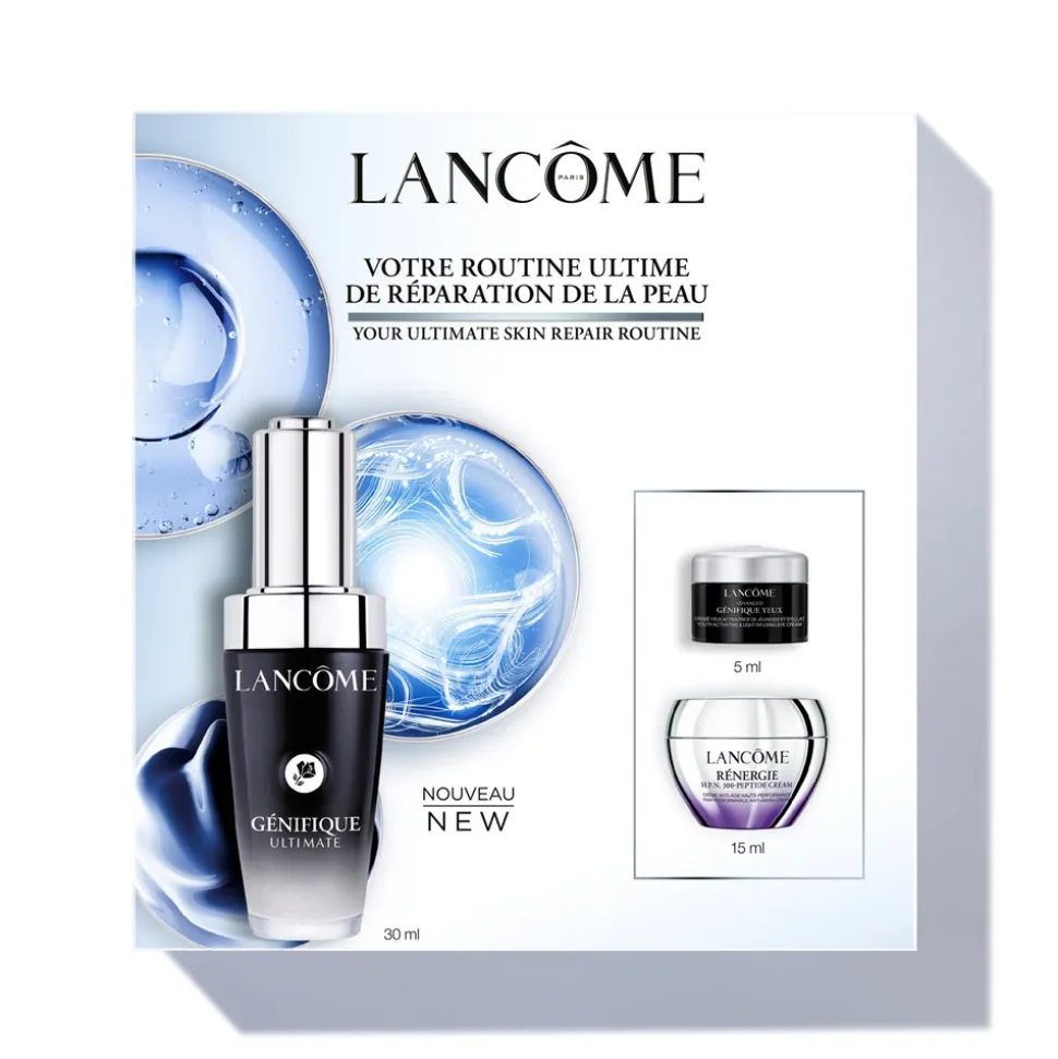 Lancôme Génifique Routine Set er perfekt til hende, der leder efter en fugtgivende rutine der styrker hudbarrieren. Oplev Lancôme Génifique Ultimate Serum. En let serum, der bidrager til hurtigere genopretning af hudbarrieren og har en effekt på alderstegn allerede efter en uge, for en hud, der ser yngre ud.