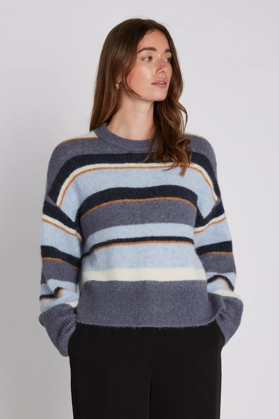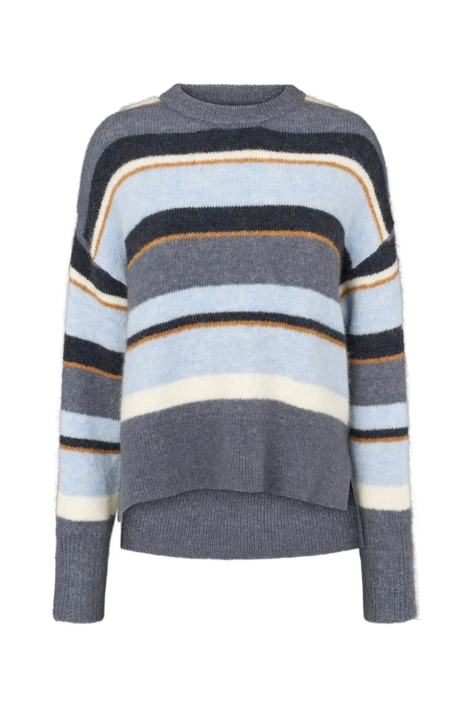 Makila Knit Sweater fra PBO er en stilfuld og behagelig striktrøje. Den langærmede trøje har en rund halsudskæring, der giver et klassisk udtryk og gør den let at kombinere med forskellige looks. Denne striktrøje er udstyret med sænkede skuldersømme, hvilket bidrager til en afslappet og moderne silhuet. Trøjens design inkluderer også en smart slids i siderne og ribkanter, der tilføjer et stilfuldt touch og sikrer en god pasform. Striberne giver et tidløst og alsidigt look, som gør denne trøje til et ideelt valg for enhver garderobe. En anden fordel ved Makila Knit Sweater er dens længere snit bagtil, som giver en flatterende pasform og ekstra dækning. Med en løs pasform er denne trøje perfekt til en behagelig dagligdags stil, der kan bæres både på kontoret og i fritiden.