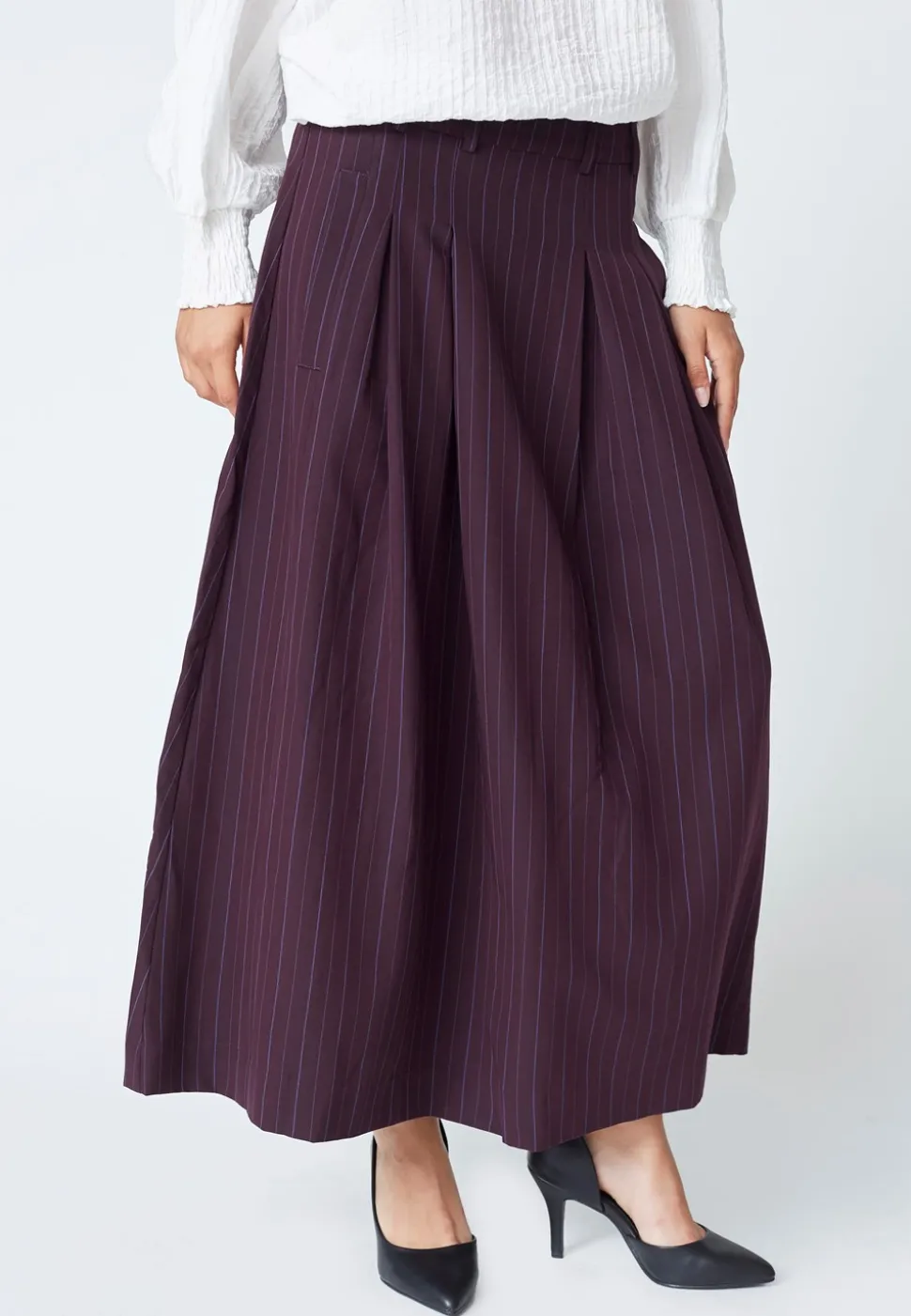 Denne nederdel kombinerer maxi-længde med et moderne design, der gør den til et must-have i enhver garderobe. De smalle striber giver et raffineret udseende, som kan bæres både til hverdag og særlige lejligheder, mens plisseringerne tilføjer en dynamisk bevægelse og tekstur til dit look. Nederdelen er udstyret med praktiske lommer i siden, hvilket giver både stil og funktionalitet. Bæltestropperne giver dig mulighed for at tilføje dit yndlingsbælte, så du kan tilpasse pasformen, som du ønsker. Lynlåslukningen bagpå sikrer en nem og sikker lukning. TrinnyCC Pleat Stripe Nederdel fra Co’Couture er en perfekt kombination af komfort og elegance, og et alsidigt valg, der nemt kan styles til både afslappede og formelle anledninger.