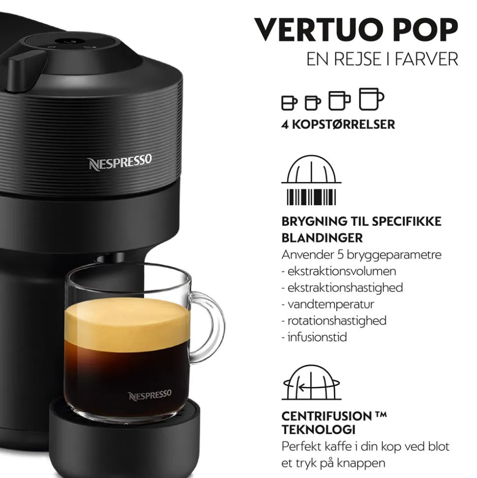 - Alsidige kopstørrelser (Mug, Grand Lungo, Dobbelt Espresso og Espresso, Alto, Iskaffe og Ristretto)